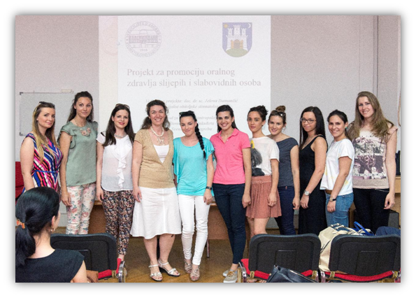 Project for oral health promotion in blind and visually impaired persons has started in 2014 in cooperation with Croatian Blind Union and Zagreb Association of Blind Persons. The project gained financial support of the City of Zagreb. The primary goals are improvement of oral health in visually impaired persons and issuing guidelines for the undergraduate dental education that would enable dental students to treat and accept patients with disabilities.