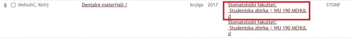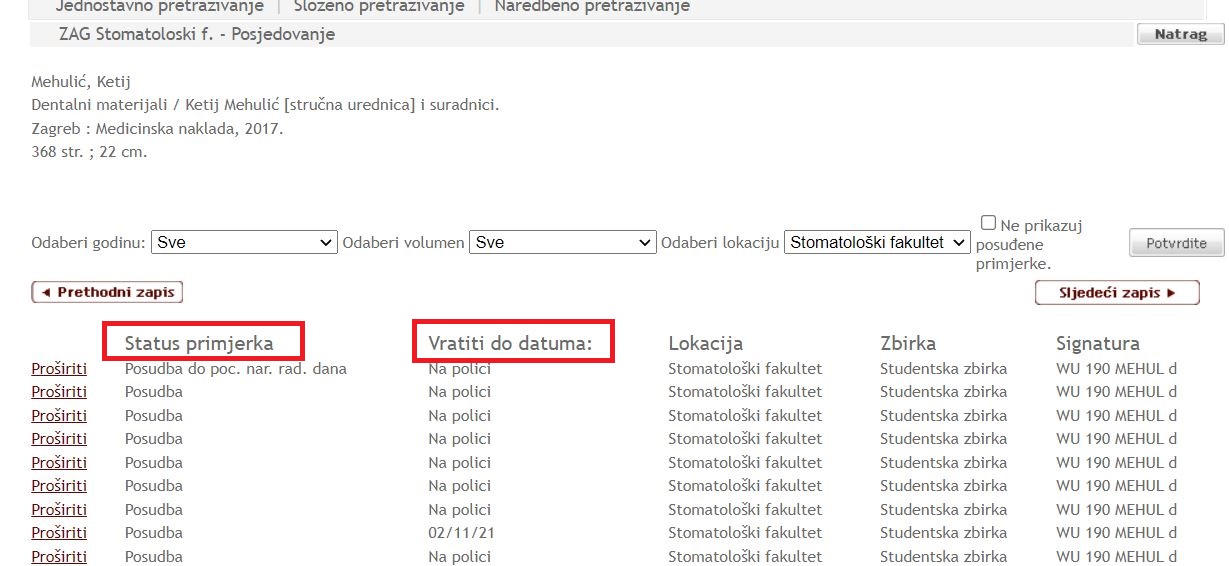 Otvorit će se prozor s prikazom svih dostupnih primjeraka tražene knjige. Uz svaki primjerak je naveden Status odnosno može li se posuditi (posudba) ili je primjerak namijenjen korištenju u čitaonici (do poč. nar. rad. dana).