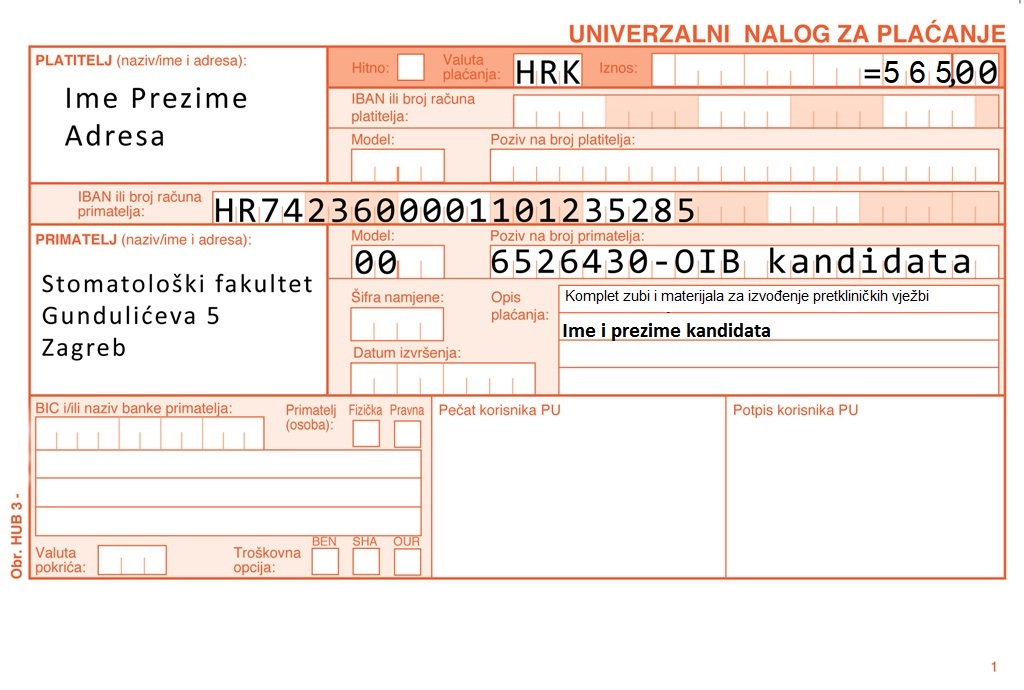 Cijena kompleta za izvođenje pretkliničkih vježbi iznosi 565,00 kuna. Prilikom dolaska na prve vježbe iz predmeta: Pretkliničke i laboratorijske fiksne protetike, Pretkliničke i laboratorijske mobilne protetike i Pretkliničke restaurativne dentalne medicine, potrebno je donijeti potvrdu o uplati kompleta za izvođenje pretkliničkih vježbi. Na račun Stomatološkog fakulteta Sveučilišta u Zagrebu uplatiti se može sa sljedećim informacijama: