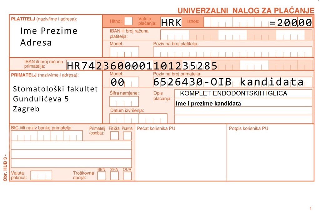 Cijena kompleta endodontskih iglica iznosi 200,00 kuna. Prilikom dolaska na prve vježbe iz predmeta Endodoncija II potrebno je donijeti potvrdu o uplati kompleta za izvođenje vježbi. Na račun Stomatološkog fakulteta Sveučilišta u Zagrebu  uplatiti se može sa sljedećim informacijama: