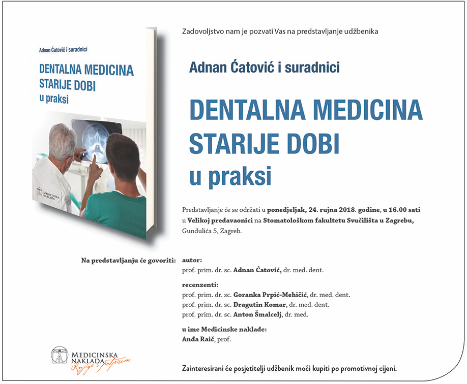 Predstavljanje sveučilišnog udžbenika pod naslovom Dentalna medicina starije dobi - u praksi održati će se u ponedjeljak 24. rujna 2018. godine u 16h u Velikoj predavaonici Stomatološkog fakulteta Sveučilišta u Zagrebu, Gundulićeva 5.
