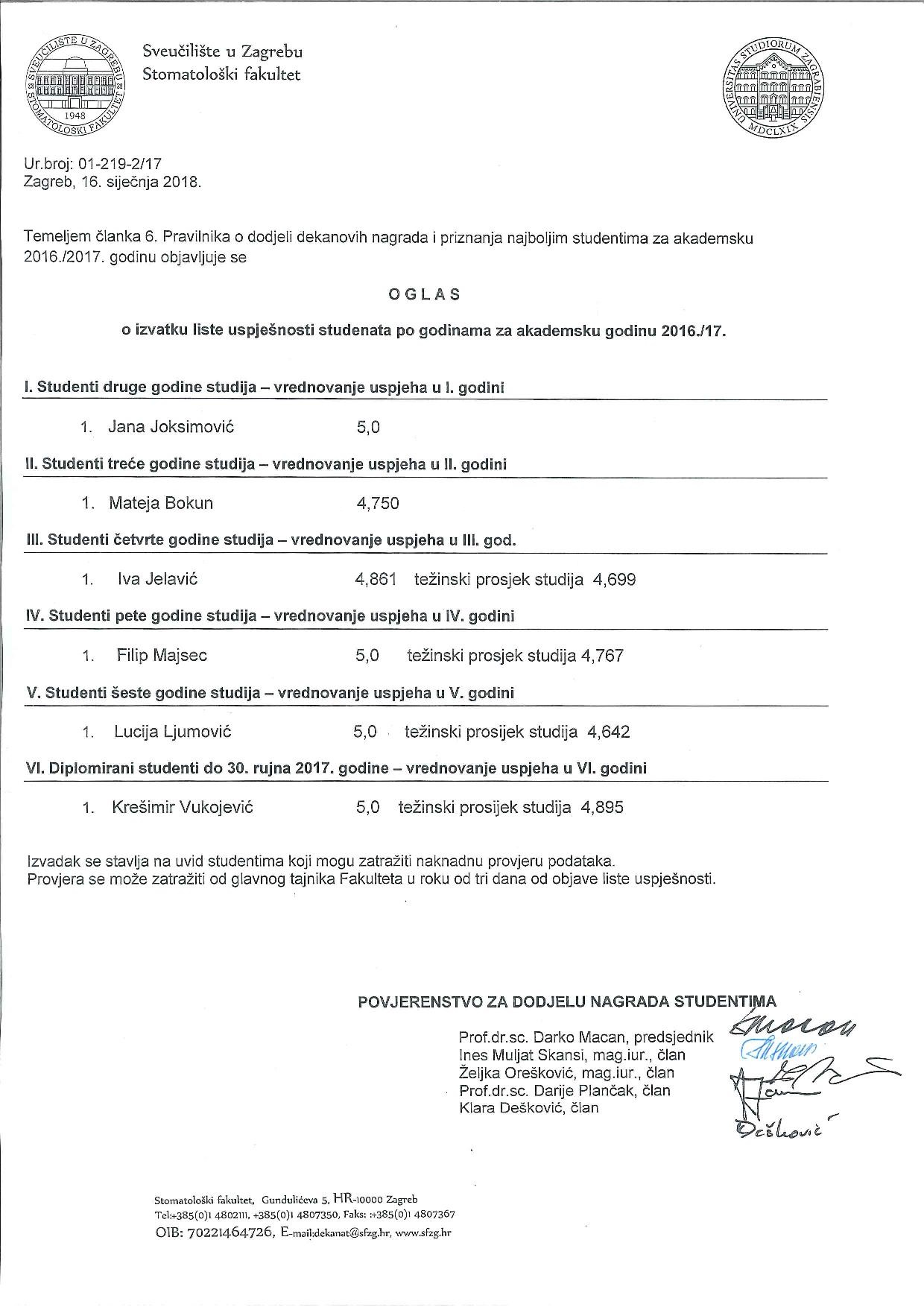 Temeljem članka 6. Pravilnika o dodjeli dekanovih nagrada i priznanja najboljim studentima za akademsku 2016./2017. godinu objavljuje se OGLAS o izvatku liste uspješnosti studenata po godinama.