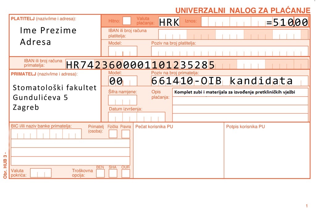 Cijena kompleta za izvođenje pretkliničkih vježbi iznosi 510,00 kuna. Prilikom dolaska na prve vježbe iz predmeta: Pretkliničke i laboratorijske fiksne protetike, Pretkliničke i laboratorijske mobilne protetike i Pretkliničke restaurativne dentalne medicine, potrebno je donjeti potvrdu o uplati kompleta za izvođenje pretkliničkih vježbi. Na račun Stomatološkog fakulteta Sveučilišta u Zagrebu uplatiti se može sa sljedećim informacijama: